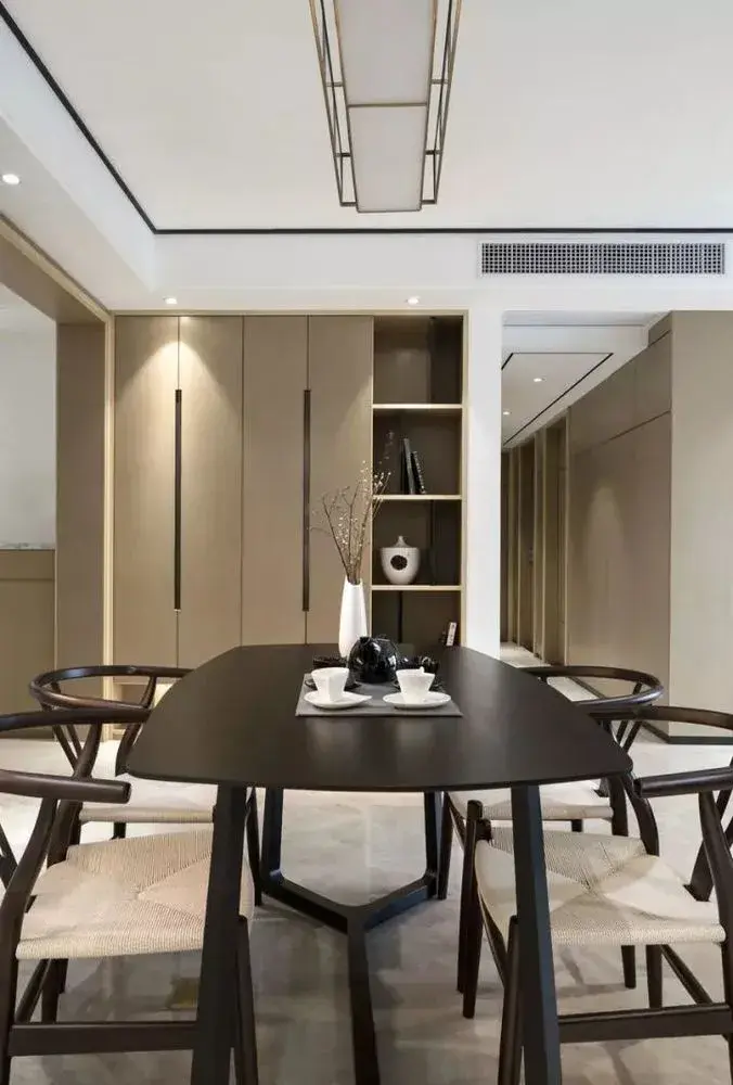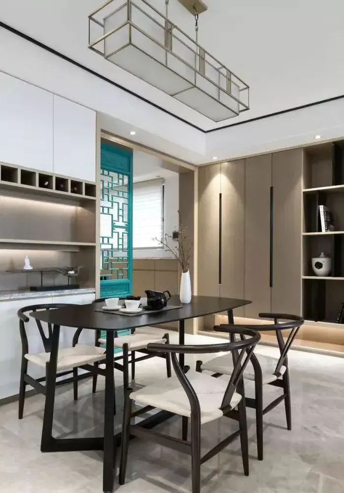 餐厅 餐厅挂一张独特的中式大吊灯+四周小射灯作为光线基础,一套黑色实木的餐桌椅,以轻松简单的造型,给人以轻松舒适的禅意氛围;餐厅背景墙上装了个收纳柜,侧边是开放的展示架,摆上禅意精致的装饰品,禅韵又高档;