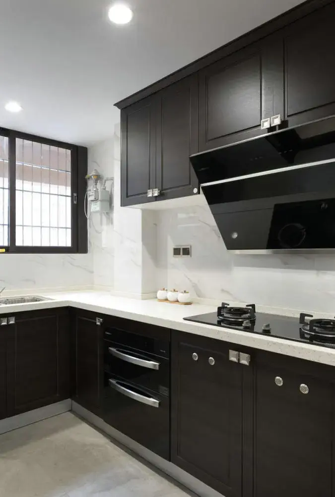 厨房 厨房墙面以大理石质感打造,搭配灰黑色的橱柜面板,整体黑白配的空间质感,优雅而又端庄高档;