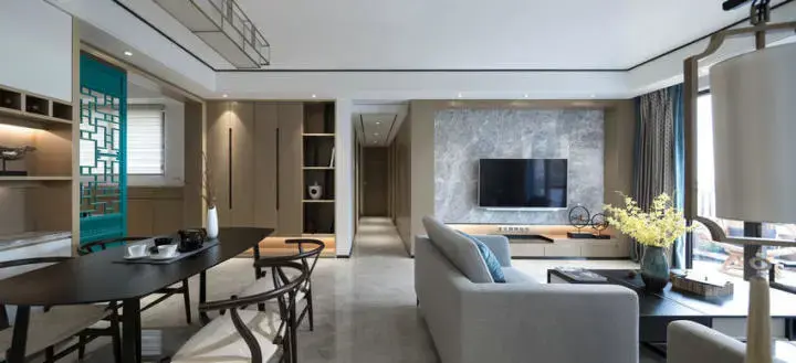 客厅 客厅以闲适的现代中式风格装修搭配,电视墙上的大理石,搭配在这个现代禅意的空间内,显示出独特优雅的高档氛围;在客餐厅区域的细节中置入一些禅意沉稳的元素,呈现出一个轻松大方的气息;