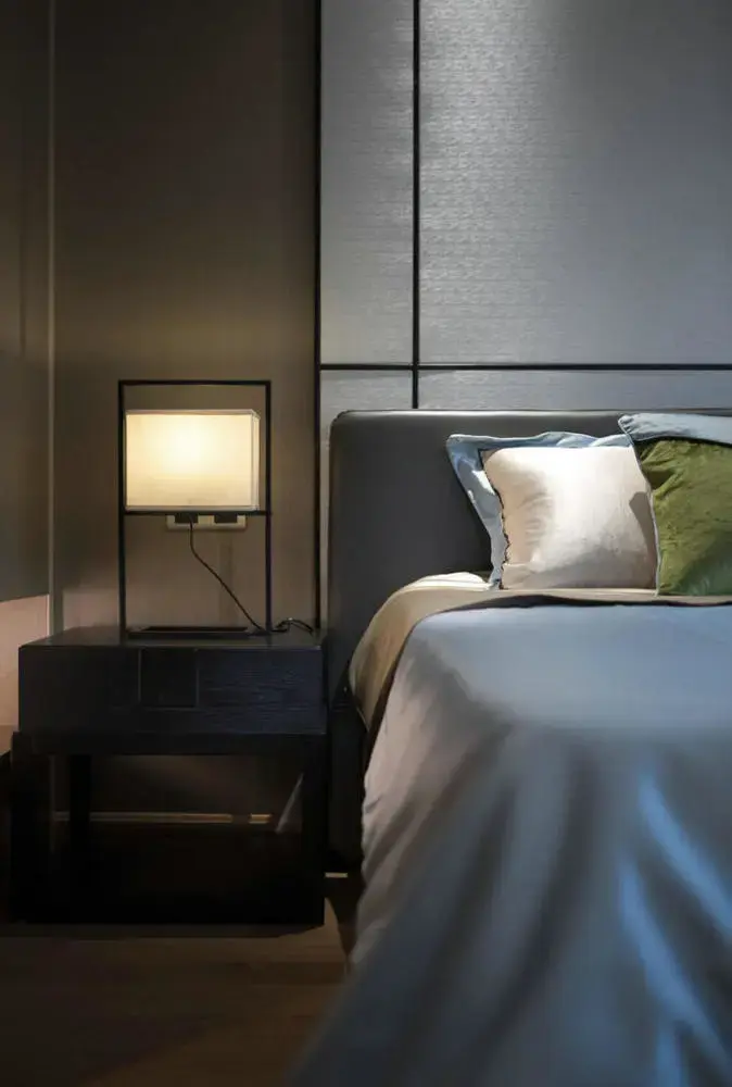 床头的装饰板与黑色线条搭配,装出独特的中式氛围感;结合蓝色丝质床单,儒雅、高档又大方;