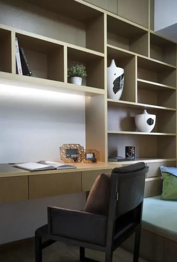 书房 书房在书桌前方装上书架展示架,摆上书籍与装饰花瓶,让书房都文雅又端庄;
