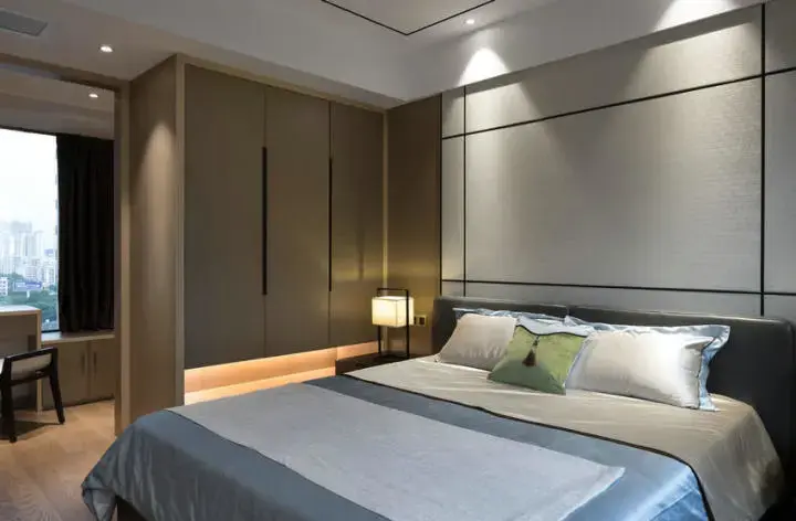 主卧 主卧把衣柜底部留空装上藏光,装出一个独特有艺术感的衣柜;整体现代轻松的空间,加入中式的儒雅元素,显得格外的优雅端庄;